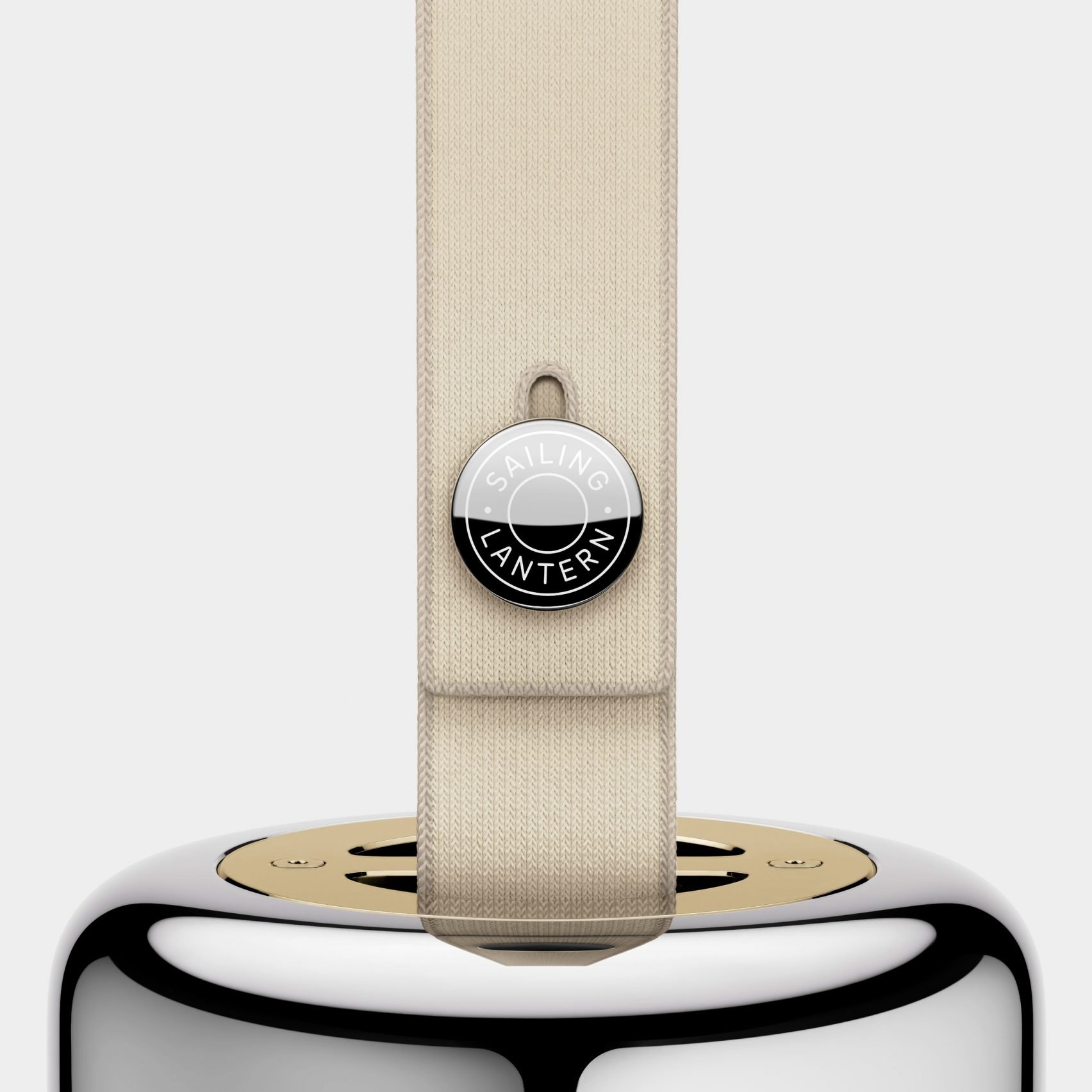 The Sailing Lantern, produced by Balmuda in Japan, manifests this shared rigor. Every curve, joint, and reflection feels deliberate. The precision machining of the brass rail — visible in macro close-up — flows like a nautical contour line, while the silicone-reinforced base ensures stability on moving surfaces. A fabric strap, stamped with “Sailing Lantern,” adds a gesture of human softness, an anchor to tactility amid metal and glass.