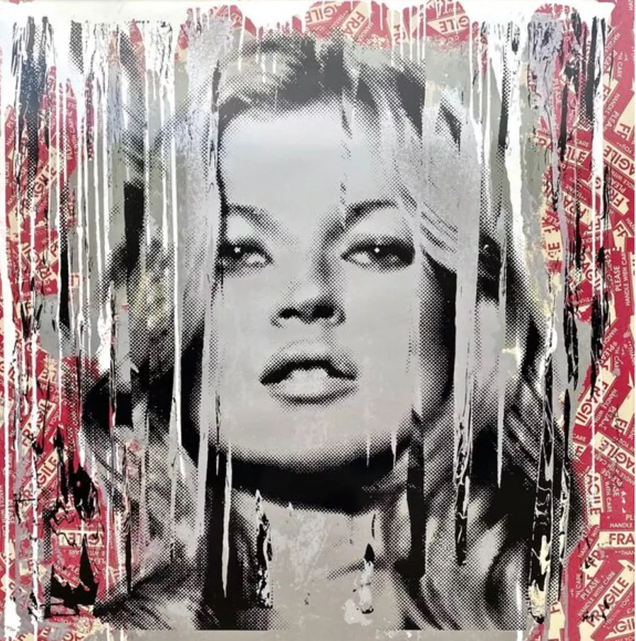 In “Kate Moss: Fragile”, Knight presents Moss in a way that deconstructs the polished images of her from fashion magazines and advertisements. The silkscreen’s slightly blurred lines and the soft, almost washed-out color palette give the work a dreamlike quality, as though the image is fading or disintegrating. This aesthetic choice reinforces the concept of fragility—not just in Moss herself, but in the very nature of beauty and celebrity.