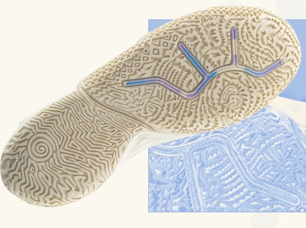 The outsole extends into a wide forefoot flare, designed to support sharp lateral movements, while the traction pattern resembles a map of intersecting paths—appropriate for a player whose game is built on creating angles that shouldn’t exist. The flexible TPU shank underfoot adds torsional support without stiffening the ride, giving Kyrie the freedom to invert or pivot on command.