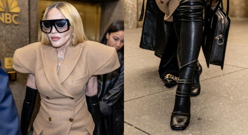 Rick Owens, known for his rebellious and experimental approach to fashion, has long been a favorite of Madonna’s for his boundary-pushing designs. The heelless boots, which defy traditional shoe construction, are a testament to Owens’ futuristic vision, appearing as though the wearer is floating above the ground. This daring footwear choice not only embodies Madonna’s fearless attitude but also complements her reputation for redefining the limits of fashion and personal expression.