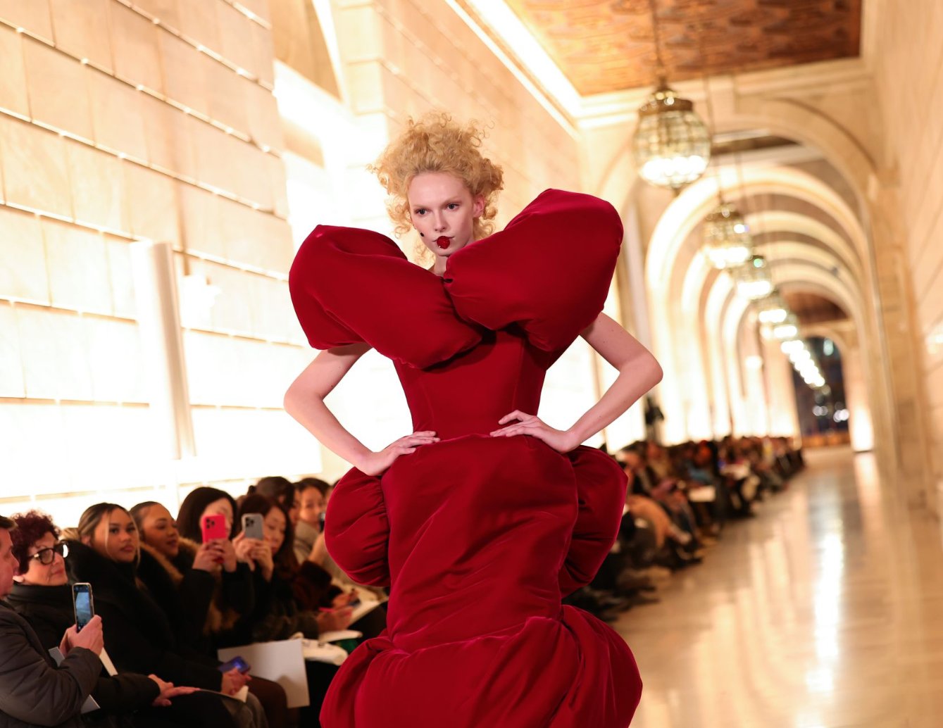 Jacobs is no stranger to theatricality, and this show was no exception. The collection was an ode to exaggerated, doll-like proportions—oversized silhouettes, cinched waists, and avant-garde details that blurred the lines between fashion and fantasy. As models glided through the grand library hall, they embodied a surrealist dream, their outfits distorting typical notions of shape and volume.
