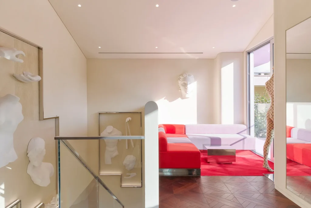 Ascending the staircase — a spiral structure bathed in warm amber light — visitors enter the upper level, devoted to transformation and rebirth. Here, fabrics, installations, and reflective surfaces create a kaleidoscopic environment. The fitting rooms, cocooned in deep crimson velvet, invite self-reflection. Even the terraces are designed as breathing spaces, adorned with stone pavements and native plants that blur the boundary between the built and natural worlds.