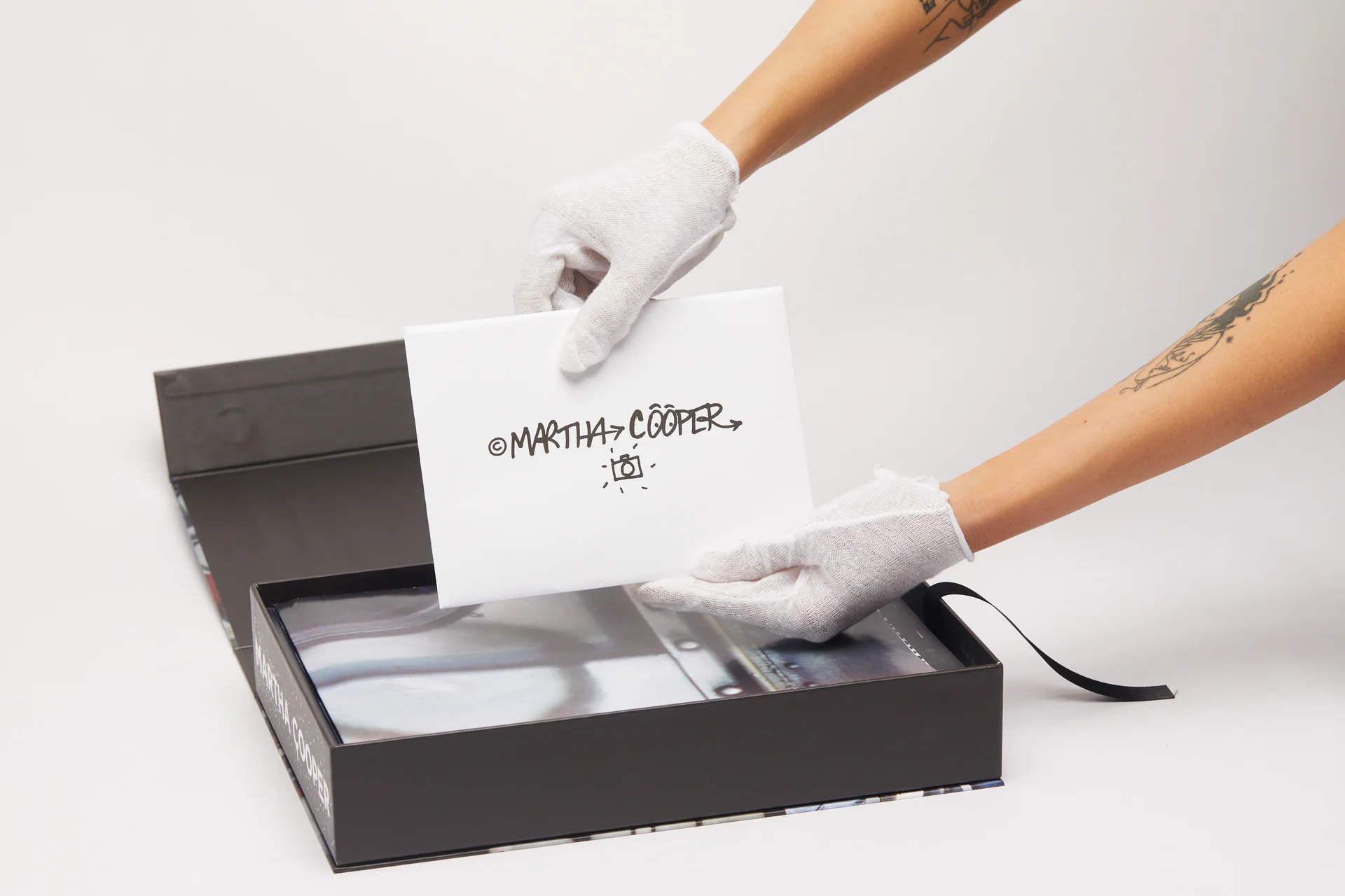 The packaging evokes archival storage boxes used by photographers. Inside, each element—books, poster, postcards—is arranged as if part of a curated archive.
