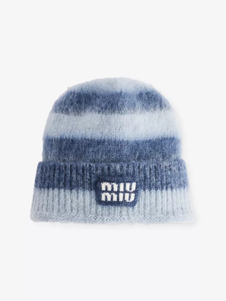 Miu Miu has always operated in the space between youthful irreverence and intellectual elegance, and the Striped Logo-Patch Wool-Blend Beanie Hat captures that balance with remarkable clarity. At first glance, it’s a simple cold-weather essential. Look closer, and it becomes a distilled expression of the house’s contemporary language—playful, referential, and quietly subversive.