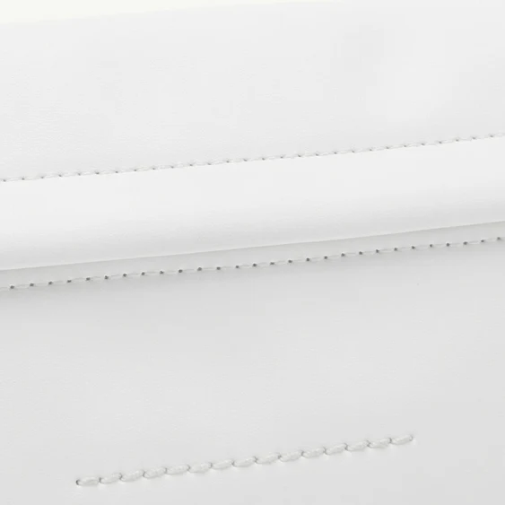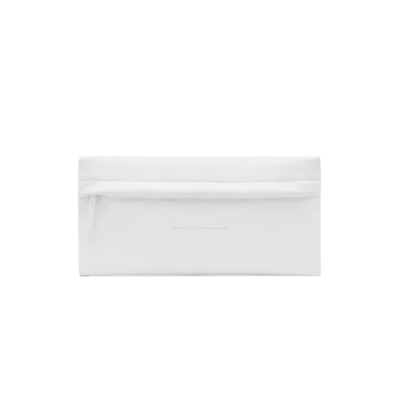 The MM6 clutch pochette stands at the intersection of conceptual design and practical use. Constructed from supple calf leather or recycled polyurethane (depending on the season’s version), it maintains a smooth, lightly structured form. The surface is deliberately clean—no visible branding except the iconic label, four white corner stitches, or a discreet zipper pull embossed with the Maison’s typographic mark.