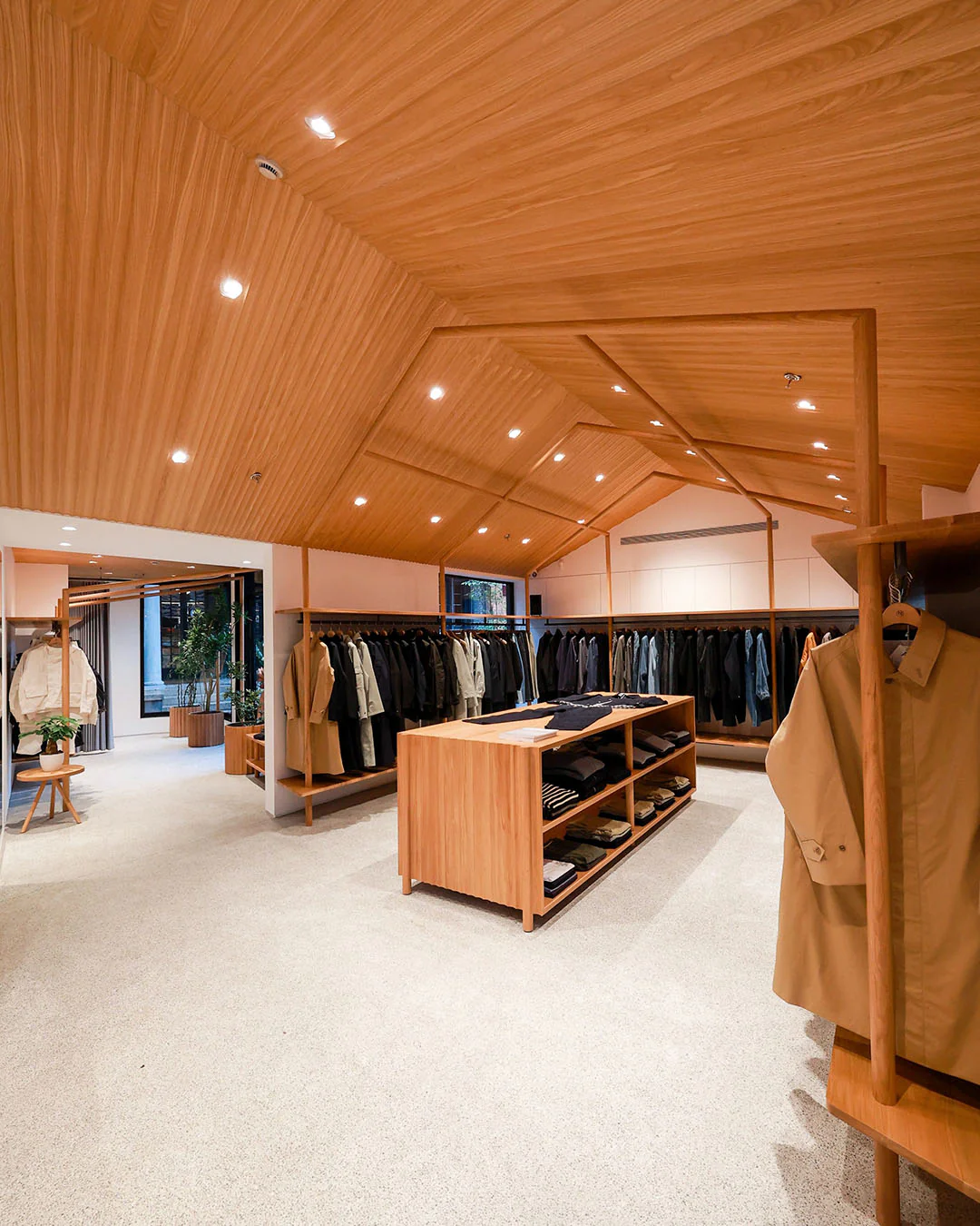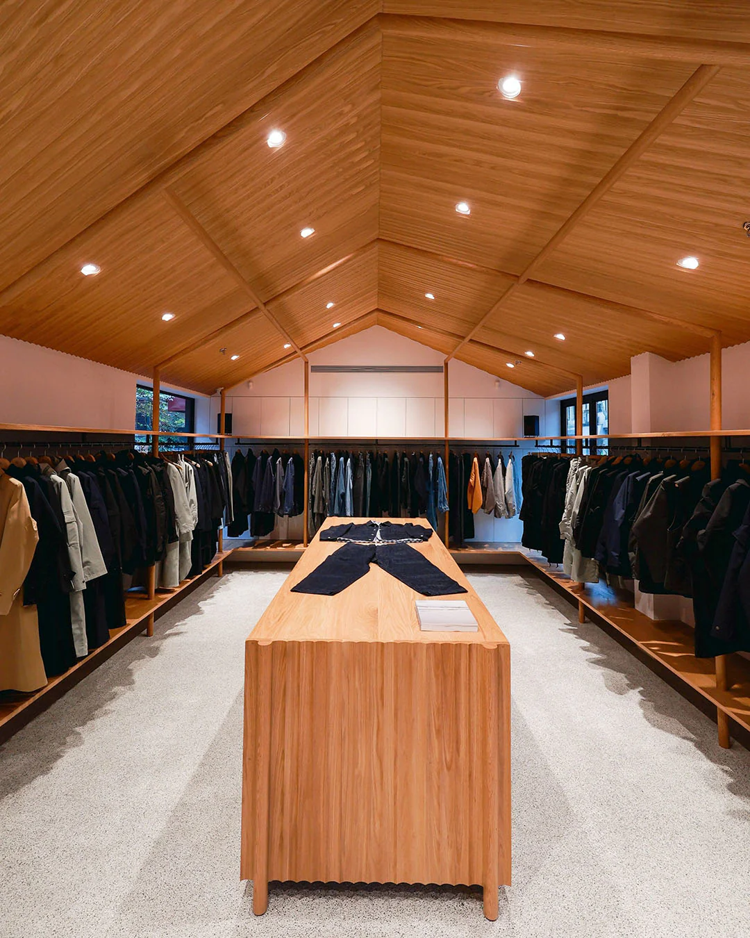 Movement through the space is deliberately unforced. Sightlines are open but not expansive, encouraging a slower pace of exploration. There are no overt focal points; instead, the store unfolds incrementally, allowing visitors to discover garments in relation to one another rather than in isolation.