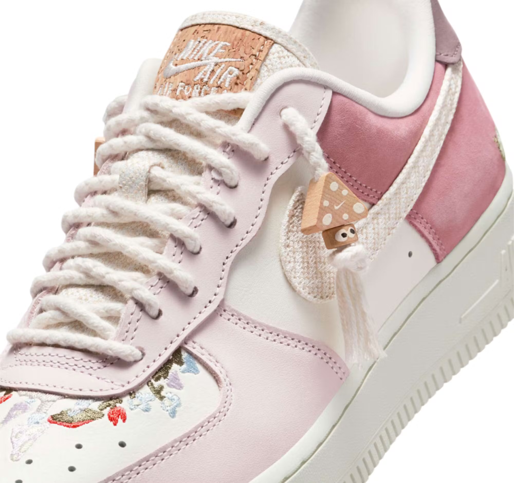 Beyond the Swoosh, another remarkable feature is the floral embroidery around the vamp, which introduces a charming, artisanal quality to the shoe. This delicate embroidery evokes imagery of mushroom-laden forests and whimsy meadows, further grounding the footwear in its nature-inspired theme.