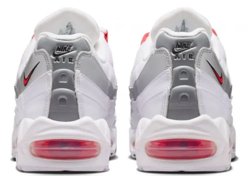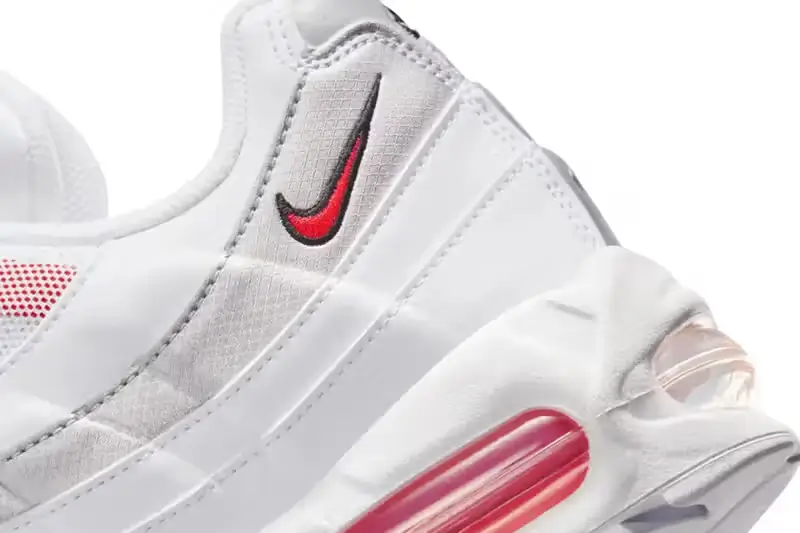 On the lateral side of the heel, a small red embroidered Swoosh adds contrast to the otherwise monochromatic upper. The placement of this miniature logo has become a defining Air Max 95 characteristic, recognized instantly by sneaker enthusiasts.