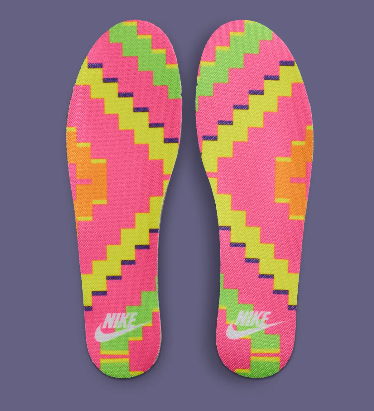 The Swoosh, typically integrated into the upper as a tonal or complementary feature, becomes something else entirely here. Rendered in a vivid green, it cuts sharply across the purple field. The contrast is immediate and intentional—less about harmony, more about tension.