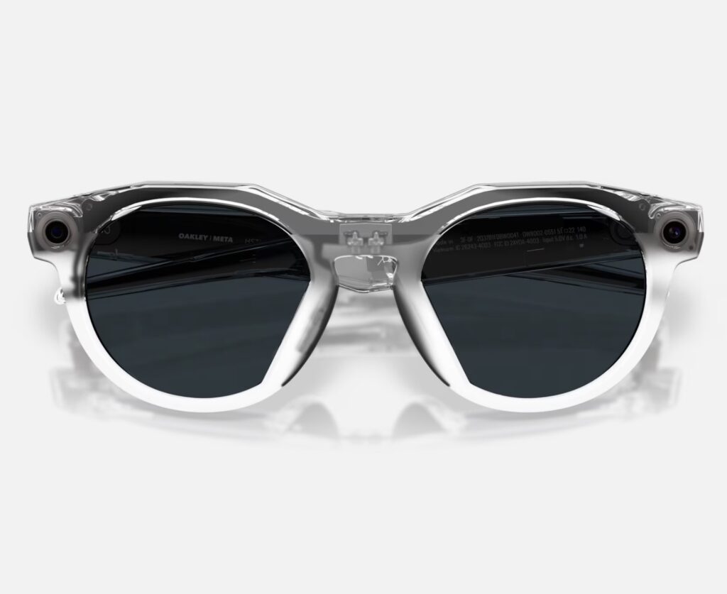 The HSTN frame has always been Oakley’s playground for pushing unconventional eyewear architecture. The latest Meta iteration takes this design forward, presenting a transparent crystal-clear acetate frame that feels futuristic yet fashion-oriented. Unlike the bulkier silhouettes of early smart glasses, Oakley’s refinement here is striking: rounded lenses housed within an angular geometric shell, paired with subtle integrated cameras at the temple corners.