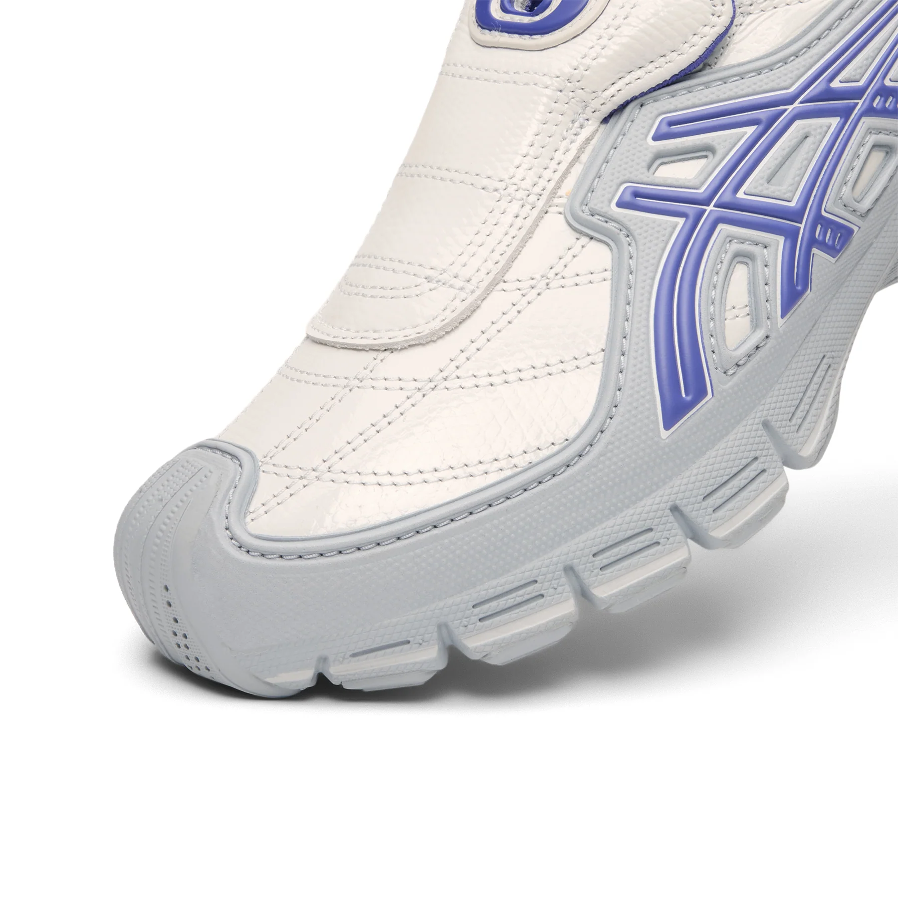 In both versions, the forefoot stitching plays a crucial role. It doesn’t simply hold panels together—it extends into the elongated tongue flap, creating a visual continuity that reinforces the wrapped aesthetic. Synthetic overlays and the iconic ASICS Tiger Stripes remain present, but they are subdued, integrated rather than emphasized. They act as structural anchors rather than branding statements.