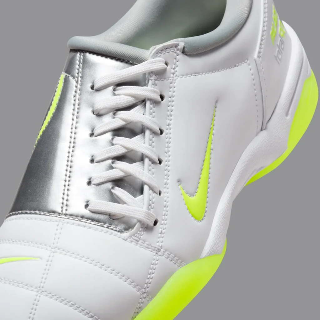 The original studded outsole has been swapped for a flat rubber sole, turning a boot built for the pitch into one ready for the pavement. The upper features crisp white leather accented by panels of chrome-like silver and vivid “Volt” green—a colorway that feels like pure Y2K energy. The combination of smooth and stitched textures across the toe box pays homage to Nike’s craftsmanship of that era, while Palace’s iconic Tri-Ferg logo sits subtly on the heel and insole.