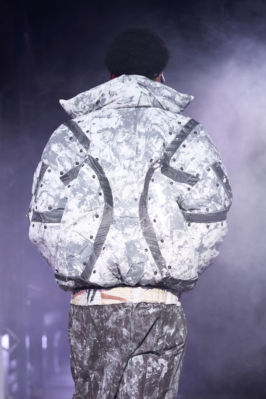 The contrast between organic textures and structured tailoring creates an aesthetic that is both raw and refined.