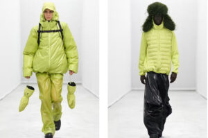 The answer unfolded in thirty rigorously engineered looks that advanced Rains’ core mission: protective outerwear that doesn’t compromise visual purity. The result was a collection that balanced utilitarian demands with refined minimalism and unexpected sensory play.