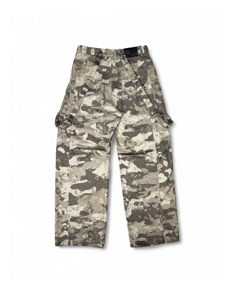 The Ravemore Berlin U.S.B. Snow Camo Pants are not simply a garment. They are a provocation—a piece of clothing that bridges the distance between military utility, streetwear bravado, and Berlin’s fragmented cultural geography. Cut oversized and patterned in a full snow camouflage print, the pants assert themselves as both armor and canvas. Their detachable bib, which can be worn up, down, or removed entirely, adds a modular edge: adaptability as fashion ethos.
