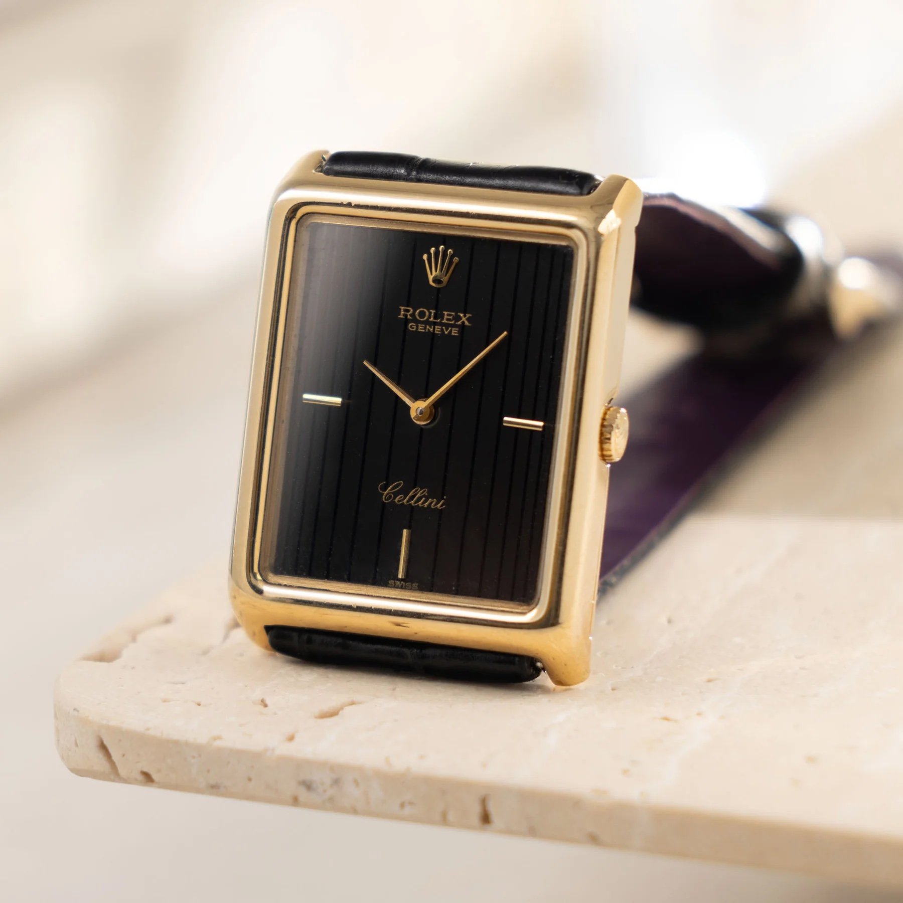 The Cellini Ref. 4105 is often celebrated for its bold design, which channels the minimalist elegance of the Cartier Tank while retaining unique Rolex touches. Its rectangular shape and luxurious finishes make it a standout piece among vintage dress watches.