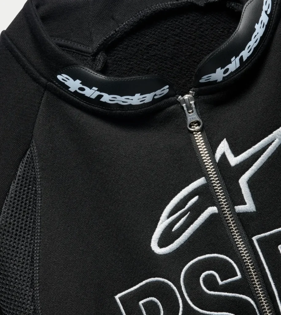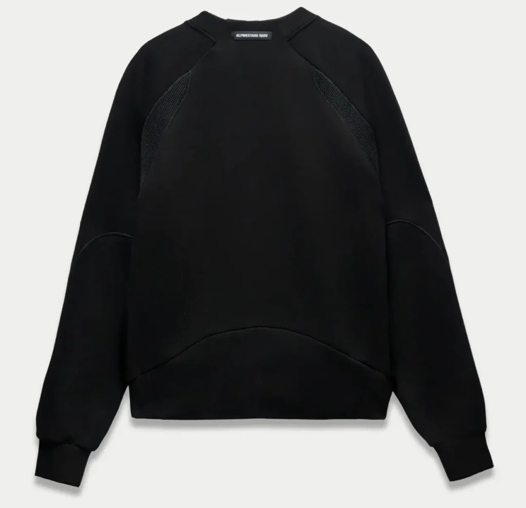 At first glance, it appears deceptively simple: a black crewneck with a short front zip, sculpted seams, and bold white “RSRV” branding across the chest. Look closer, however, and the s weatshirt reveals itself as a modular hybrid—part riding layer, part street staple, part conceptual uniform—engineered with the same attention to movement and reinforcement that defines Alpinestars’ racing gear.