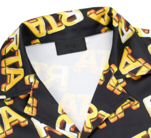 Subtle metallic threadwork weaves throughout the material, revealing itself only when caught by specific lighting. This detail gives the shirt a quiet shimmer, a bullion-like glint that lives in the tension between luxury and restraint. You’re not meant to see it from afar; you’re meant to notice it during conversation, in intimacy, in proximity. RTA doesn’t scream—it murmurs with confidence.