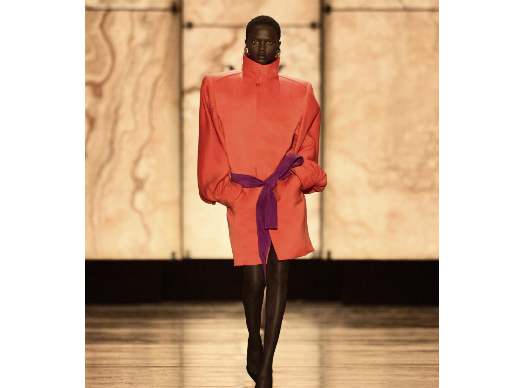 Take the coat dresses—glossy, high-collared, and modestly belted at the waist. Their architecture, though simple, summoned a kind of Eastern elegance, with silhouettes that evoked both the strictness of Japanese tailoring and the fluidity of ink brush painting. In their pared-down strength, these pieces echoed not only Vaccarello’s design intelligence, but also Yves Saint Laurent’s quiet obsession with global classicism.