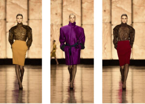 Vaccarello’s stated aim was to distill the collection to its core gesture—to build looks that felt as if they were formed by “a few pencil strokes.” The metaphor is apt. There was an almost calligraphic restraint to the garments, a balance between negative space and curved line that made each ensemble feel choreographed rather than constructed.