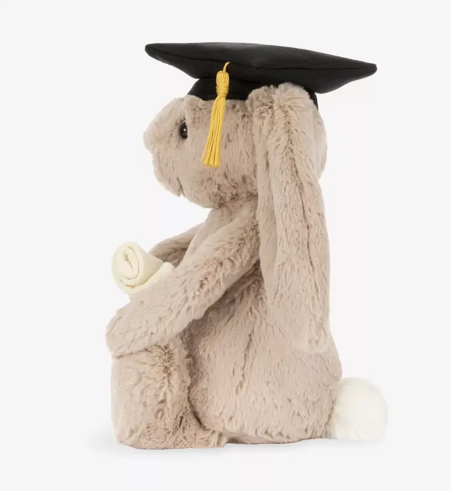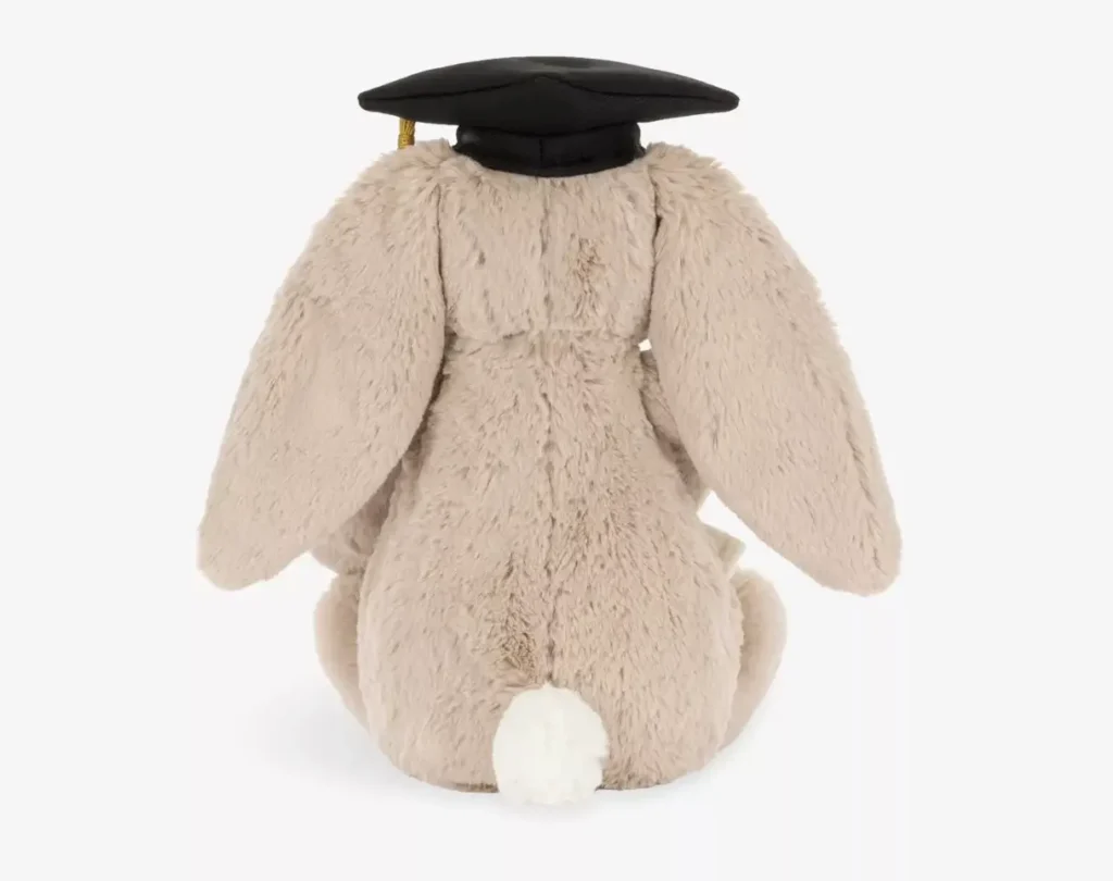 Rather than leaning into novelty, the design keeps things restrained. The graduation elements are light additions, allowing the bunny to maintain its original charm and versatility.
