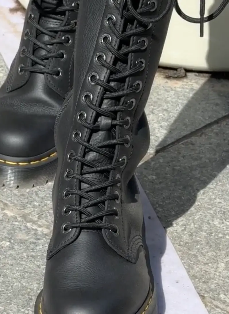 The 1B60 is defined first and foremost by its height. Rising to the knee, the boot elongates the leg in a way that feels both assertive and architectural. Unlike traditional riding boots or streamlined leather styles, this silhouette is unapologetically structured. It borrows from combat boot lineage but amplifies it—more eyelets, more lacing, more intent.