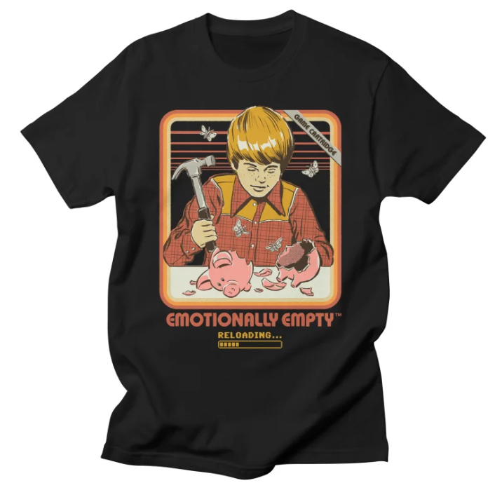 At first glance, the T-shirt seems lifted straight from a 1970s classroom visual aid or a Reader’s Digest booklet about emotional development. The image is framed with thick, warm-toned borders — soft oranges, muted yellows, and browns that evoke memories of wood-paneled dens and rotary telephones. A cherub-faced boy, rendered in graphic halftone style, is shown gleefully destroying a piggy bank with a hammer. Inside the broken ceramic shell, instead of coins or savings, flies buzz out — symbols of decay, emptiness, and perhaps the death of childhood ideals. Beneath the scene, in blocky arcade-era type, the shirt reads: “EMOTIONALLY EMPTY™,” followed by a reloading bar as though depletion were something temporary, fixable, or game-like.