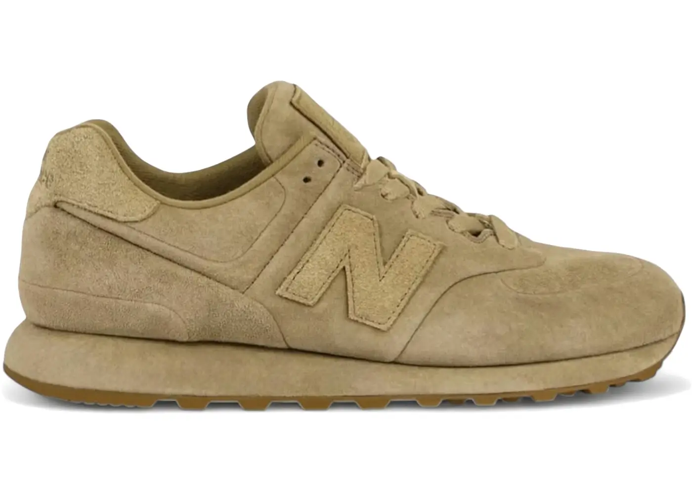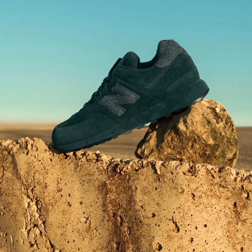 Translating this philosophy into footwear required careful reinterpretation. Sneakers traditionally rely on visible contrast to highlight structural components—especially a silhouette like the New Balance 574, known for its layered suede panels, mesh base, and bold side logo.