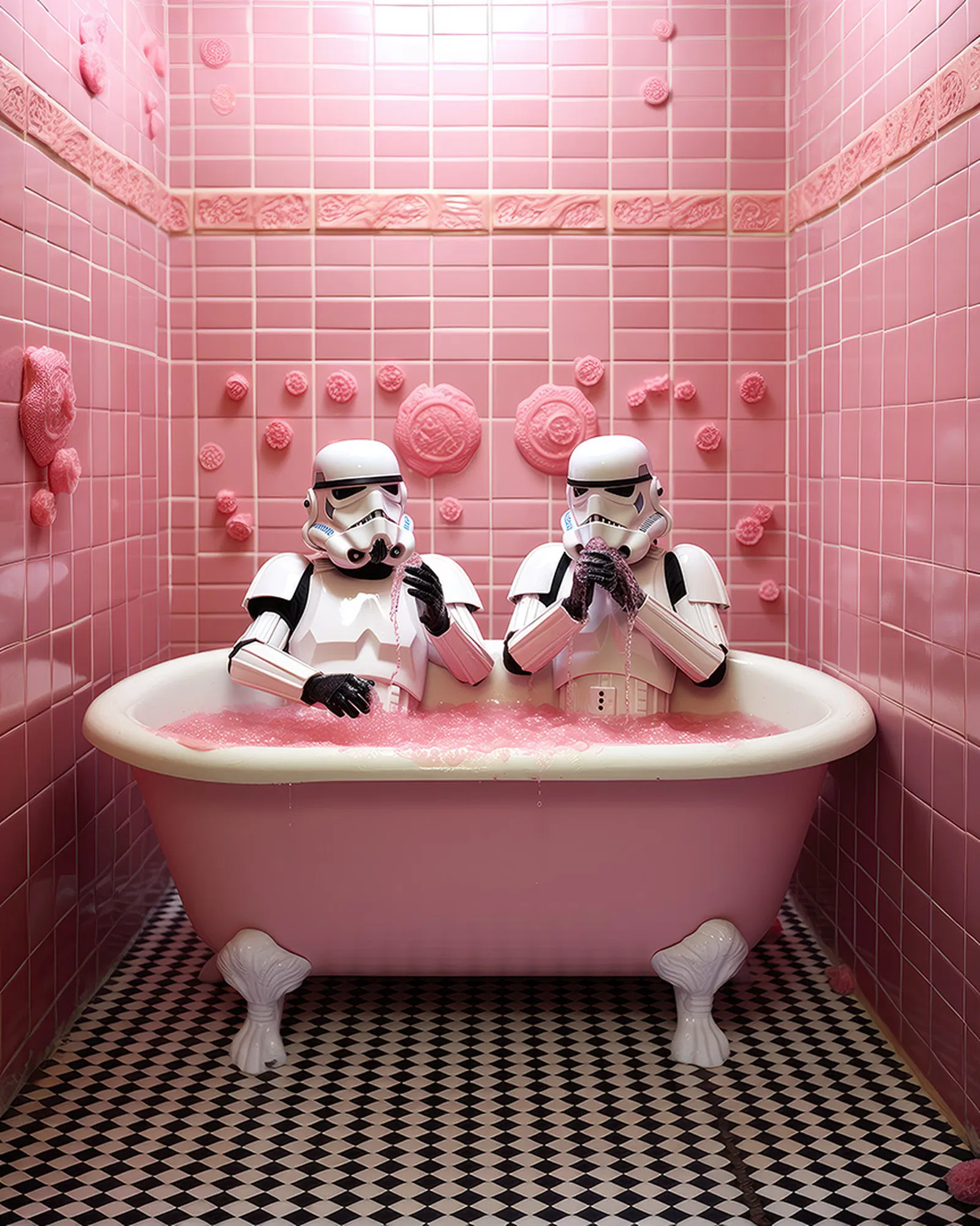 In Suds and Siths, the enigmatic conceptual artist Slender O’Kenoshi repositions some of the most recognizable figures in popular cinema within an environment that is deliberately unfamiliar. The stormtroopers—normally seen in militarized formations, advancing across galactic battlefields—are instead found seated in a vintage claw-foot bathtub, surrounded by pastel tiles and ornamental flourishes. The scene is incongruous yet carefully staged, a tableau that disarms the iconography of uniformed authority and reframes it through domestic ritual.