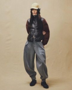 The proportions flirt with exaggeration, but never lose wearability. Jackets bubble slightly around the shoulders, trousers taper then flare. Each piece feels ready for a hike, a commute, or a runway. And that adaptability — physical and stylistic — defines the collection’s power.