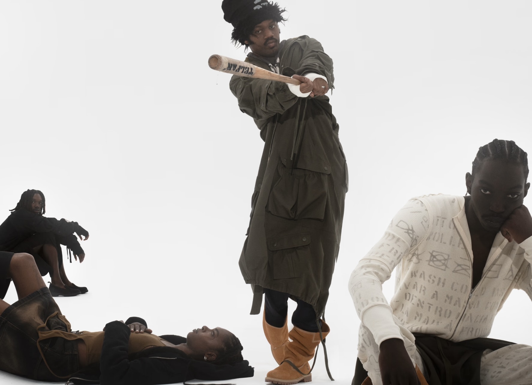 Meanwhile, the editorial tableau with multiple models (Image 1) demonstrates variance on a different plane. The man wielding a Telfar-branded baseball bat in military green outerwear embodies aggression and defense; beside him, another model lounges in logo-printed knitwear, his expression contemplative. On the floor, a reclining figure evokes softness and vulnerability. Together, they stage a multiplicity of roles, emotions, and narratives within a single frame. Variance here is not only about clothing silhouettes, but about the full emotional and cultural bandwidth fashion can occupy.