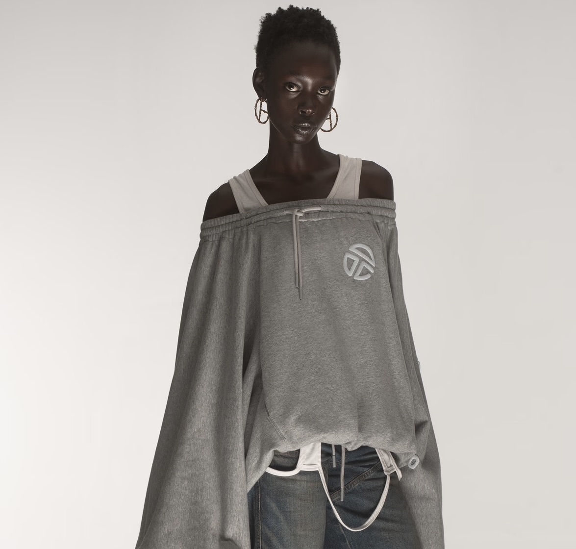In Fall 2025, flow is literalized through silhouette. Take the oversized grey hoodie (Image 2): a garment normally coded as casual is slouched off the shoulders, cinched at the neckline, and ballooned into sculpture. It floats between sweatshirt and eveningwear, between sportswear and high-art installation.