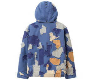 Let’s start with the object itself. The blue patchwork canvas jacket is, on paper, a midweight zip-up. But that description flattens it. In reality, it’s a tactile collage: swatches of dyed canvas in varying shades of blue, stitched like a love letter written in fragments. The zip runs up the middle, framed by a broad collar. The silhouette is boxy but intentional—like it’s wearing its own outline.