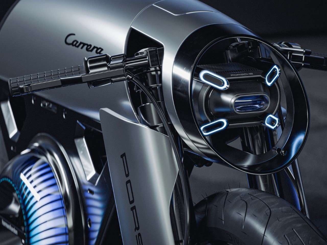 Porsche Café Racer concept motorcycle with aerodynamic teardrop design, silver finish, and Carrera-inspired styling