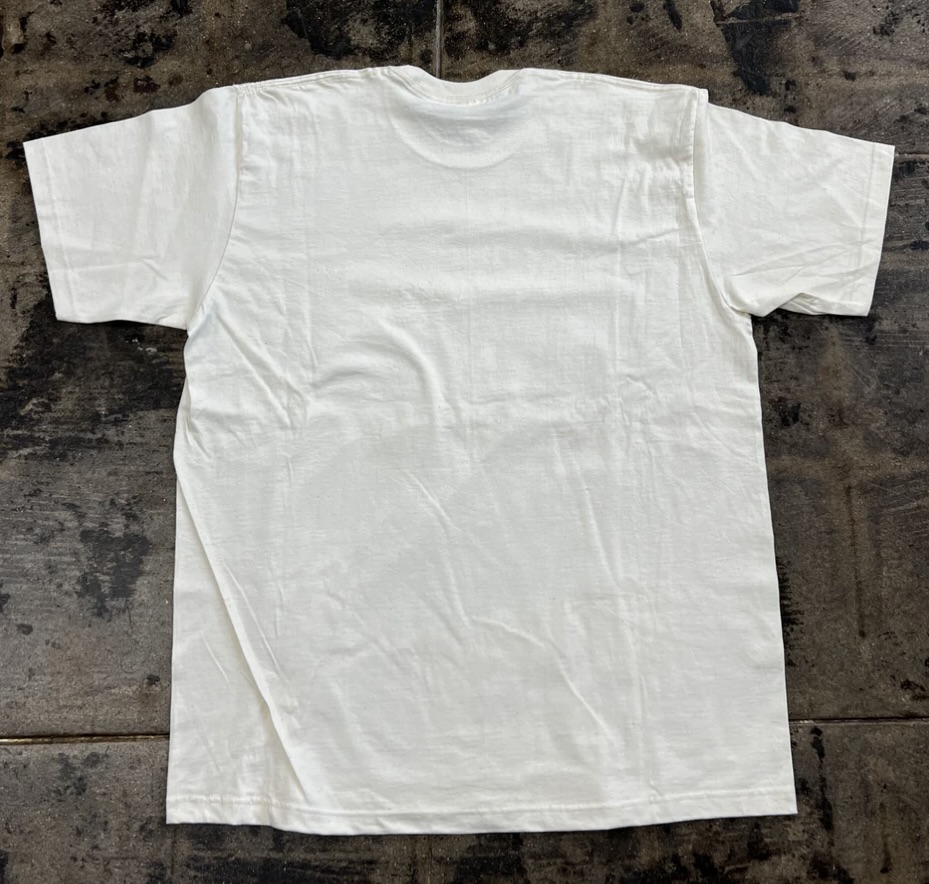 crafted from heavyweight cotton, the tee feels substantial — a tactile reminder of supreme’s origins as a skate brand that values durability as much as design. on the side of the collage, the brand’s iconic logo appears subtly, vertically aligned, balancing out the visual noise with clean minimalism. the print is screen-applied with a vintage finish, giving it the slightly worn texture that collectors seek in authentic releases.
