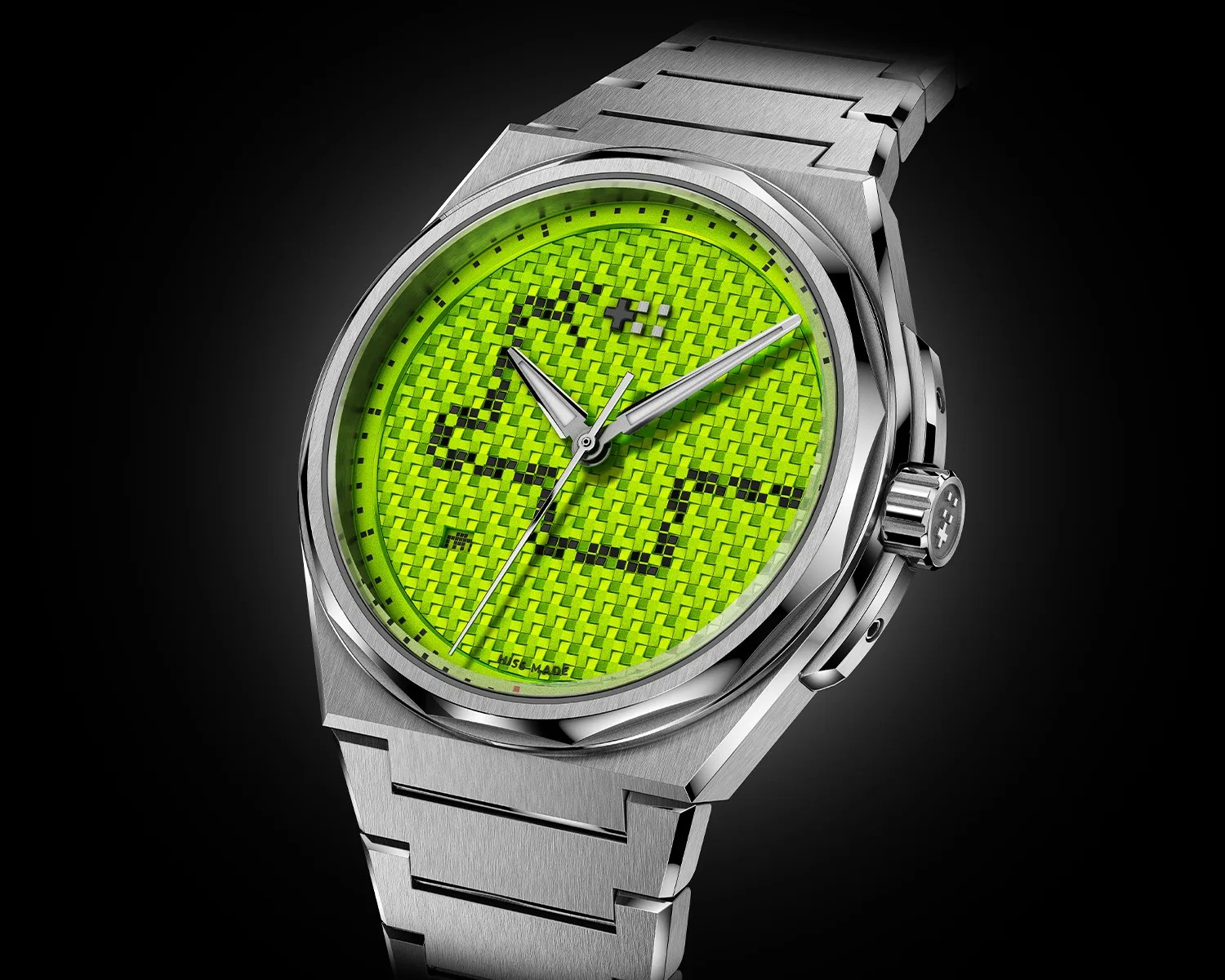 The most striking feature of The Twelve Snake is undoubtedly its dial. The watch’s usual textured surface remains, featuring a repeating raised pattern of the brand’s twin flags logo, but it has been given a distinctive pixelated appearance through creative printing. This design choice gives the impression of a retro digital display, evoking memories of early LCD screens on vintage mobile phones and handheld gaming devices.