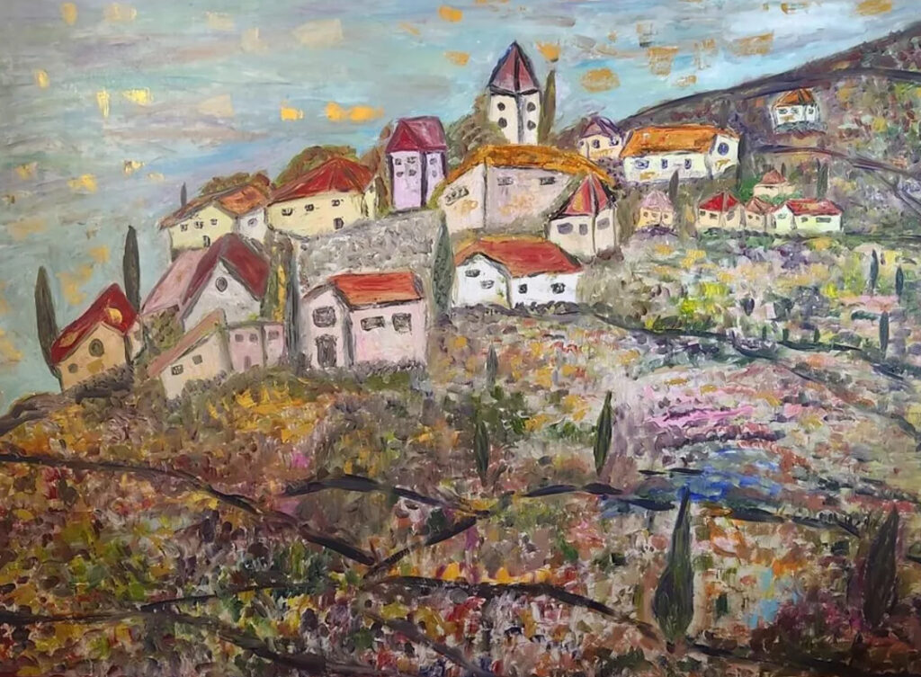 Having lived in Israel for most of her career, Schwartz’s work is heavily influenced by the Mediterranean and Middle Eastern landscapes. The rustic charm of the mountain village in this painting shares similarities with: