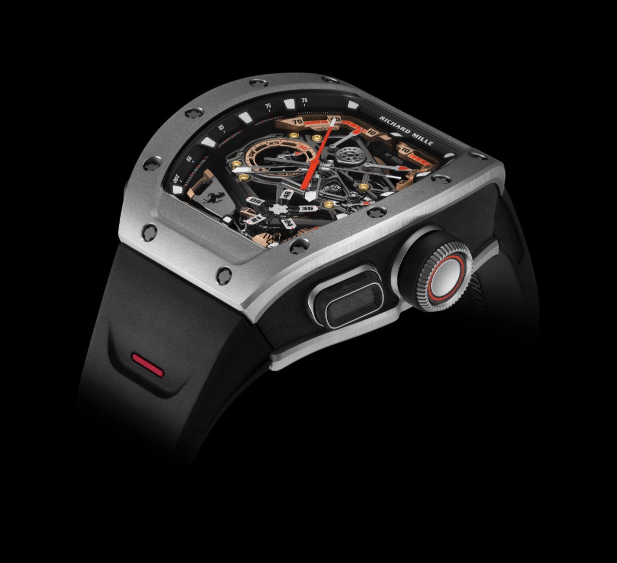 Richard Mille’s “form follows forces” worldview is visible everywhere. The tonneau case is not simply curved; it’s sculpted to manage torsion, shock, and sealing across a three-part case construction, using spline screws and engineered gaskets that maintain compression under thermal variation. Carbon TPT®—a proprietary, layered carbon composite—provides high specific stiffness at low mass and delivers that instantly recognizable striated grain; Grade 5 titaniumbrings aerospace familiarity and a colder, technical sheen. Both versions are limited to 75 pieces apiece, sharpening collectibility to track-only exclusivity levels.