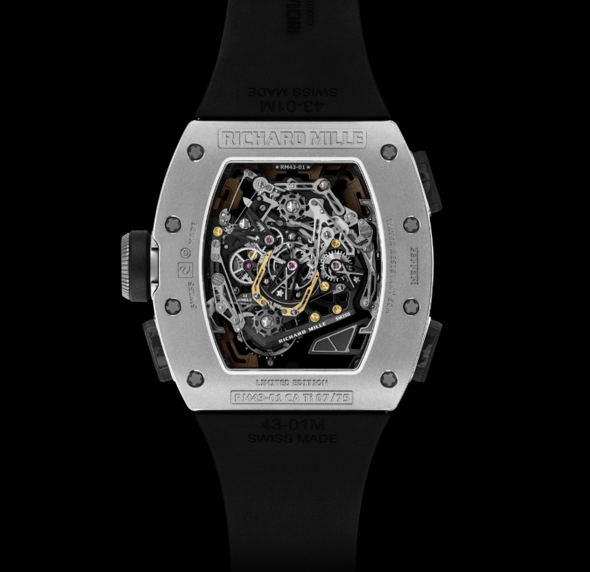 In the abstract, a tourbillon compensates for positional rate errors by averaging them across a rotating cage. In a watch meant to be thrashed in real-world dynamics, some might question whether a tourbillon is necessary. Richard Mille’s answer has always been yes, if the cage and its supports are engineered for shock resistance and the rest of the going train is specced to keep amplitude stable under intermittent loads (e.g., chronograph engagement). The RM 43-01’s tourbillon, offset within the architecture, is framed intentionally as an engine bay: visible, celebrated, and hardened.