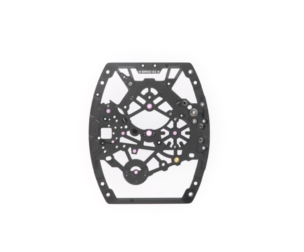 Inside sits Calibre RM43-01, a manual-winding architecture built on a highly skeletonized grade 5 titanium baseplate, reinforced by bridges in titanium and Carbon TPT®. The rattrapante mechanism is the headline: this is Richard Mille’s latest-generation split-seconds—developed with APLL—which addresses the classic pain points of rattrapantes (fragility, drag, reset alignment) with robust kinematics, revised tolerances, and weight-optimized components. The total component count clears 500 parts (officially 514), yet the power reserve remains approximately 70 hours when the chronograph is idle—testimony to efficient energy management and friction reduction across the gear train.