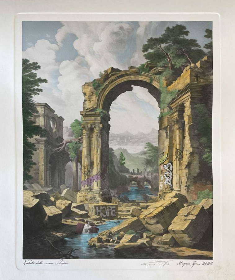 Magnus Gjoen, a celebrated artist known for juxtaposing classical art and contemporary techniques, has once again demonstrated his artistic genius with his work Vedut A Delle Rovine Romane. This piece, inspired by the grandeur of Roman ruins and executed with a mix of watercolour, aquatint, and digital engraving, transcends the traditional boundaries of art to evoke a profound dialogue between the past and present.