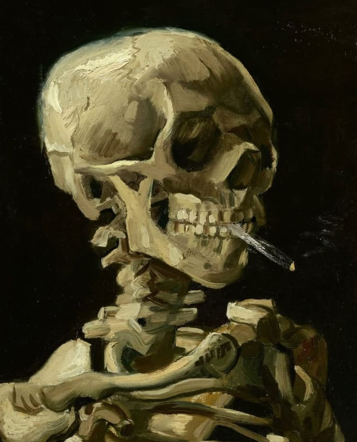 Against this backdrop, the painting reads as both satire and subtle rebellion. The skeleton, rendered with delicate precision and almost classical restraint, suddenly breaks protocol: it smokes. The cigarette, its ember glowing faintly in Van Gogh’s otherwise muted palette, transforms the academic exercise into a darkly comedic visual pun. Death is not solemn here; it is flippant, irreverent, alive.