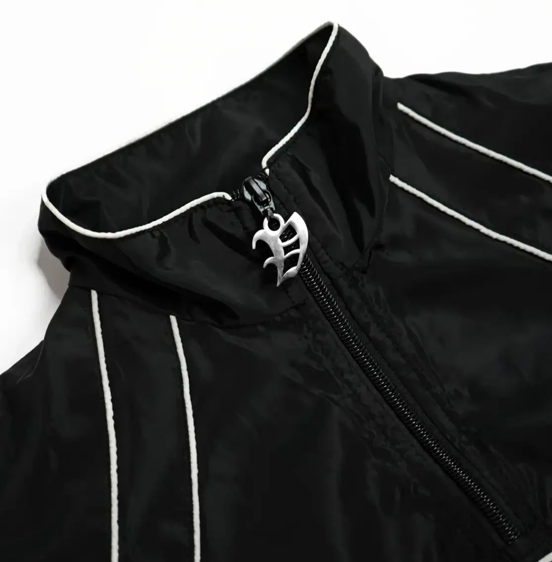 “Radiant Aura” is less a name than a condition—something sensed before it is seen. Visionary Club’s NYLON TRACK JACKET (NIGHT PULSE) positions itself inside that threshold, where visibility becomes a form of presence rather than exposure. The title carries dual movement: radiant suggests emission, outward energy; aura suggests containment, a field that surrounds rather than declares. Together, they establish a garment that does not simply exist in space but alters how space registers around it.