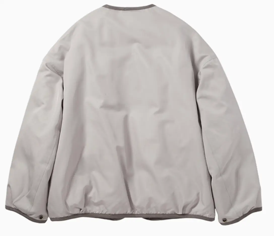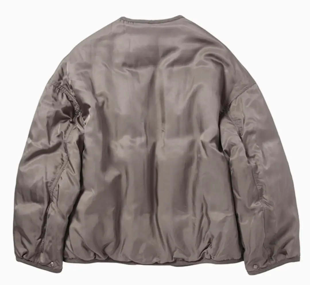 The Liner Down JKT W takes this utilitarian template and refines it through a distinctly Japanese design sensibility. The silhouette is relaxed but controlled, allowing the jacket to drape naturally while maintaining a clean, structured outline. The collarless neckline emphasizes layering versatility, making it easy to wear over knitwear or beneath heavier coats.