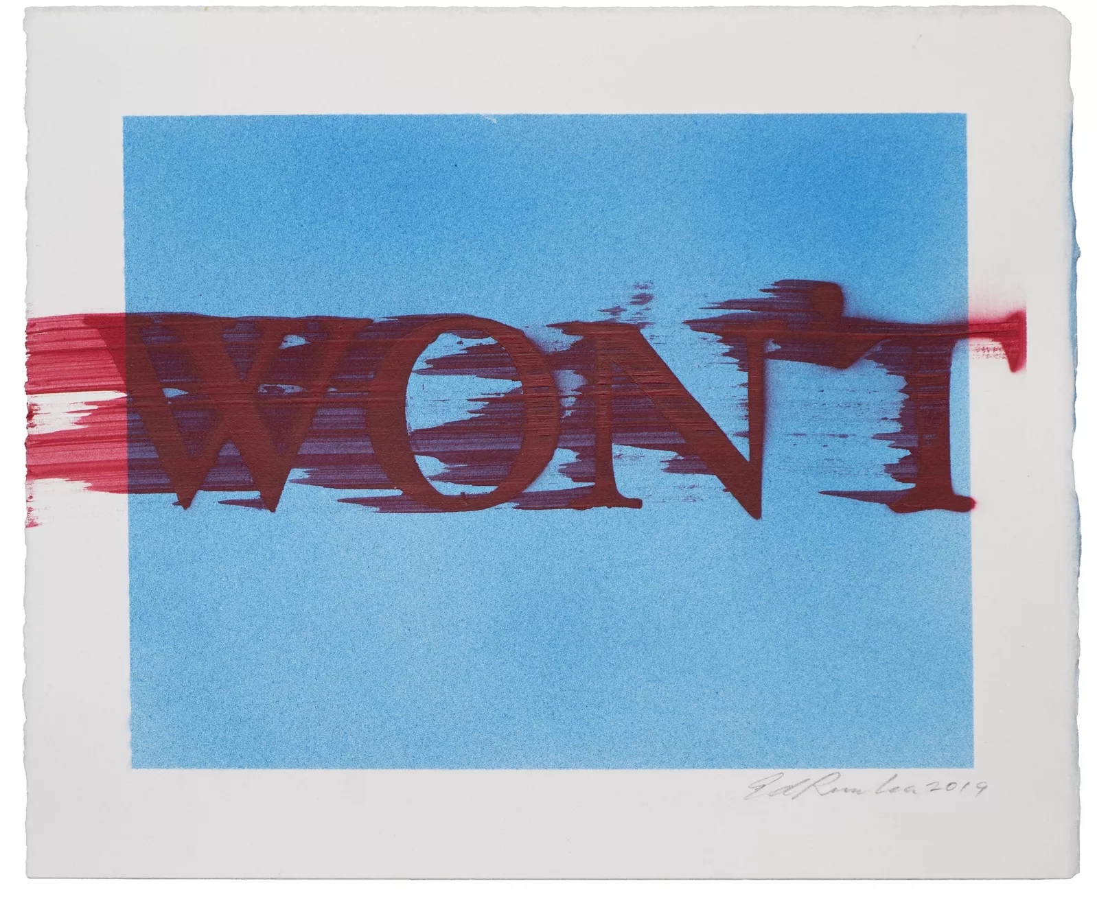 What makes WON’T particularly powerful is its balance between formal rigor and painterly spontaneity. The blue square is carefully measured, almost digital in its geometry. The typography is printed with the precision of a typesetter. Yet the red stroke that crosses it all introduces imperfection — the human hand in rebellion against the mechanical. In this sense, the painting embodies one of Ruscha’s central artistic concerns: the tension between the reproducible image of the American vernacular and the individual mark of expression.
