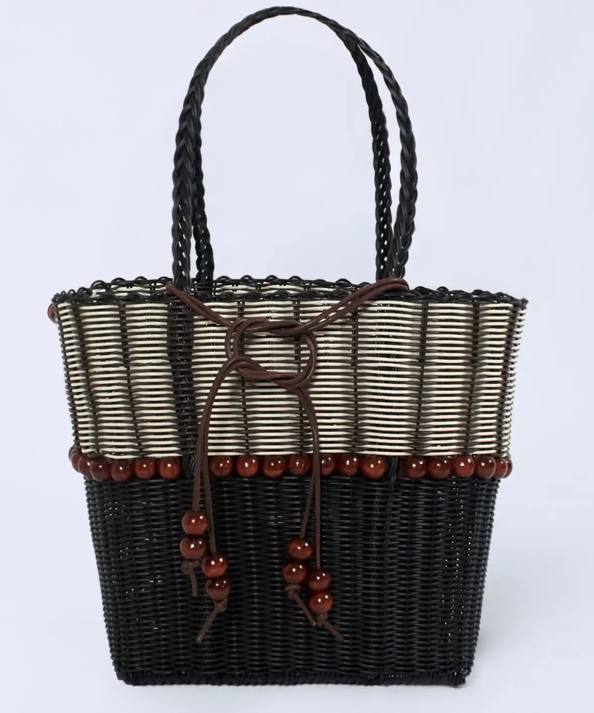 The bag’s structure is divided into visual thirds — dark base, beaded midline, pale upper. This ratio mimics architectural grounding: stability at the bottom, openness at the top. The braided handles, rather than stitched leather straps, reinforce his appreciation for tactile continuity. They rise organically from the body of the basket, as if grown from it.
