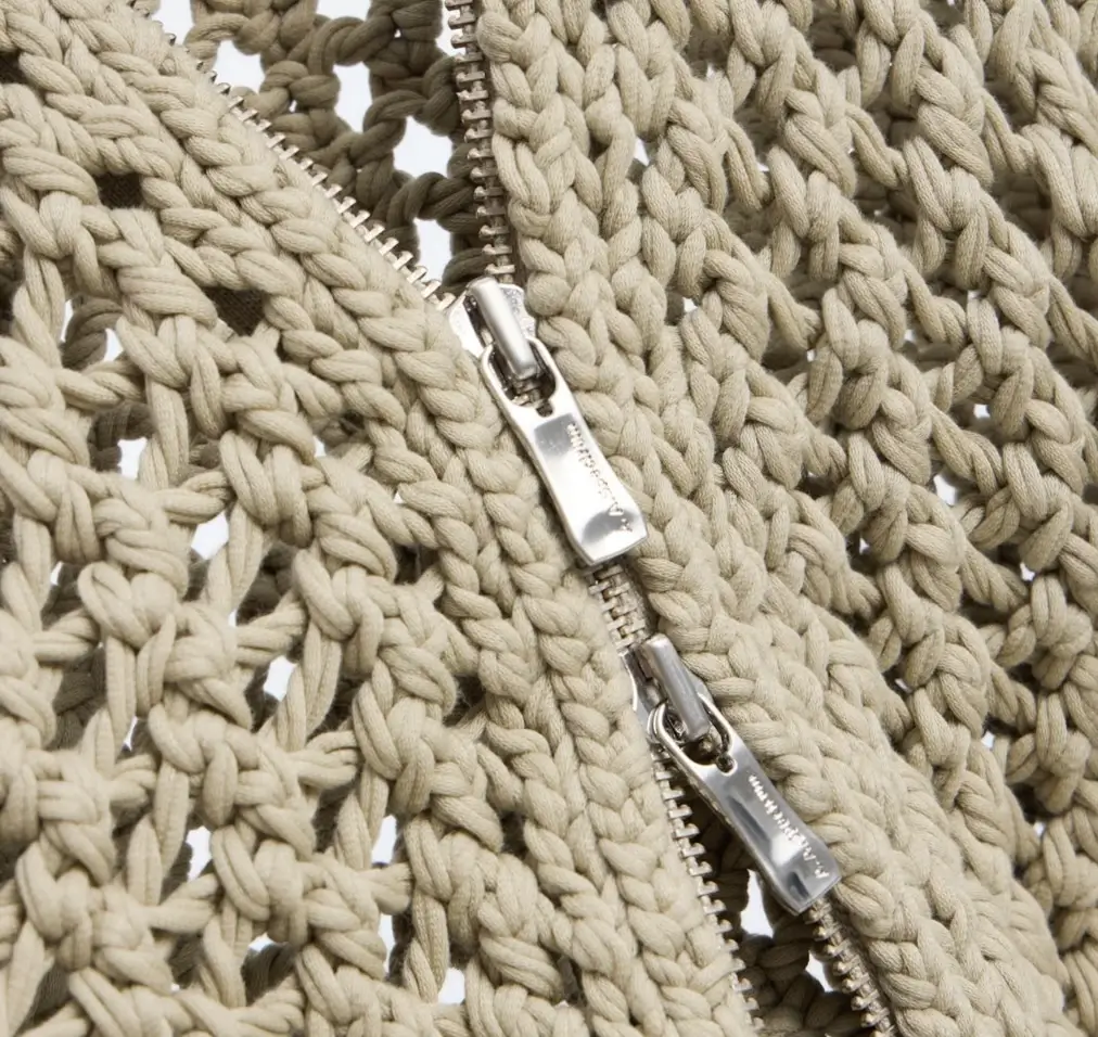 The metallic zipper introduces a different language entirely. Where the knit is soft, organic, and expansive, the zipper is linear, precise, industrial.